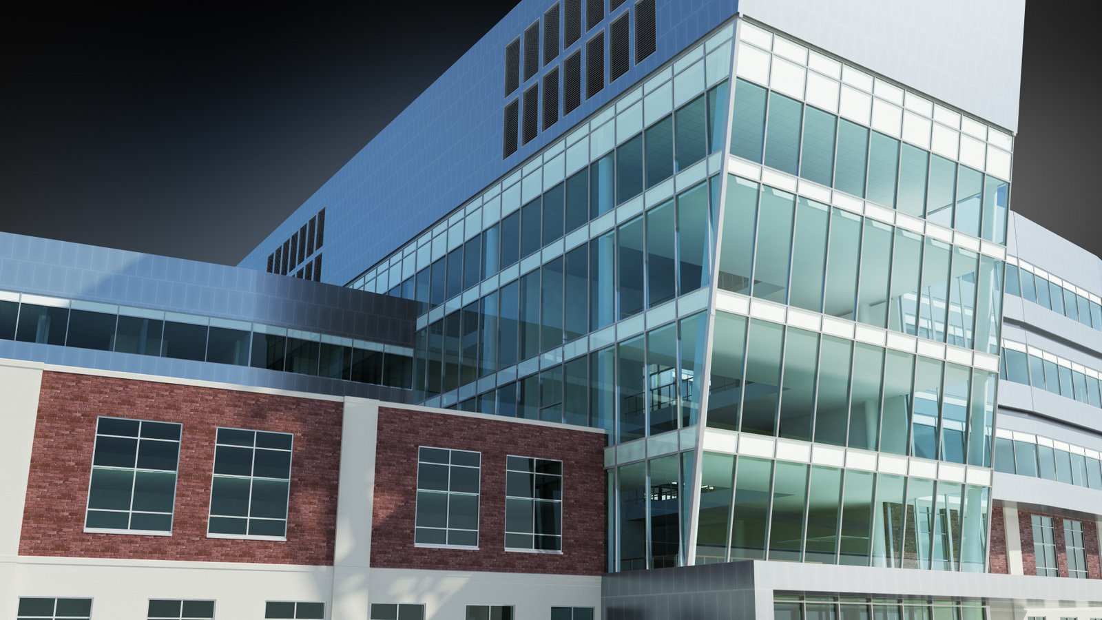 BIM for Building Design Demand Gen Toolkit image highlighting exterior architectural elements. CAPTION (see Marketing Guidelines Site for caption usage details): Rendering of the BIM City Westside Hospital data set, highlighting exterior architectural elements. Autodesk(r) Revit(r) Architecture, Autodesk(r) Revit(r) MEP, Autodesk(r) Revit(r) Structure, and Autodesk(r) 3ds Max(r) Design software products were used in the design process.