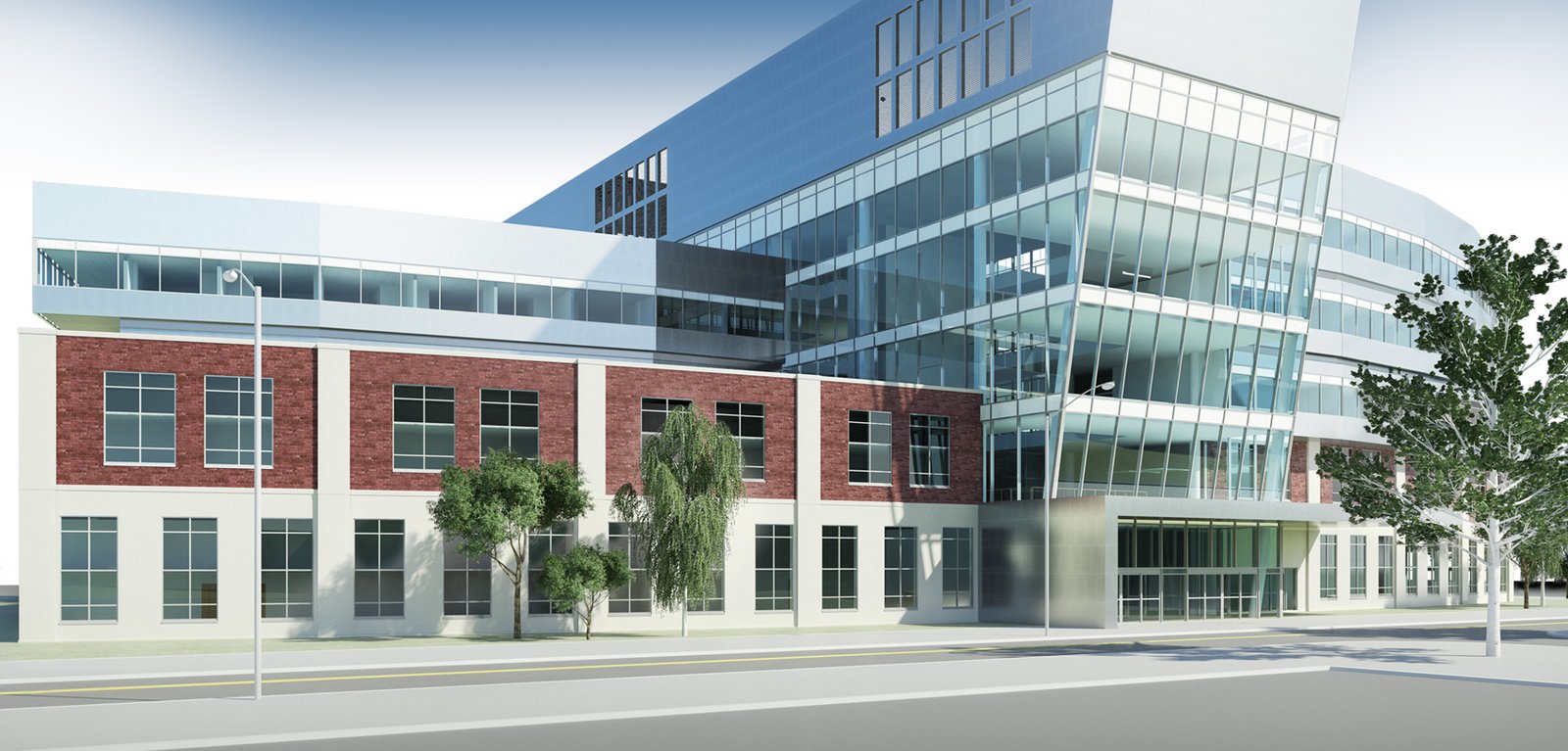 Refreshed cropped version of the BIM for Building Design image with trees added, highlighting exterior architectural elements. Rendering of the BIM City Westside Hospital data set, highlighting exterior architectural elements. Autodesk(r) Revit(r) Architecture, Autodesk(r) Revit(r) MEP, Autodesk(r) Revit(r) Structure, and Autodesk(r) 3ds Max(r) Design software products were used in the design process.