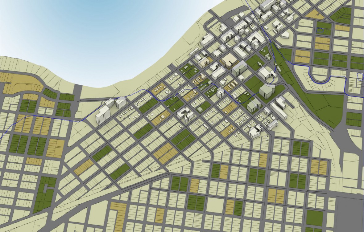 Rendering of a cityscape showing thematic mapping and analysis of land parcel, land use information, land development, and extruded building footprints. Created in AutoCAD(R) Map 3D software. Rendered in Autodesk(R) 3ds Max(R) software.