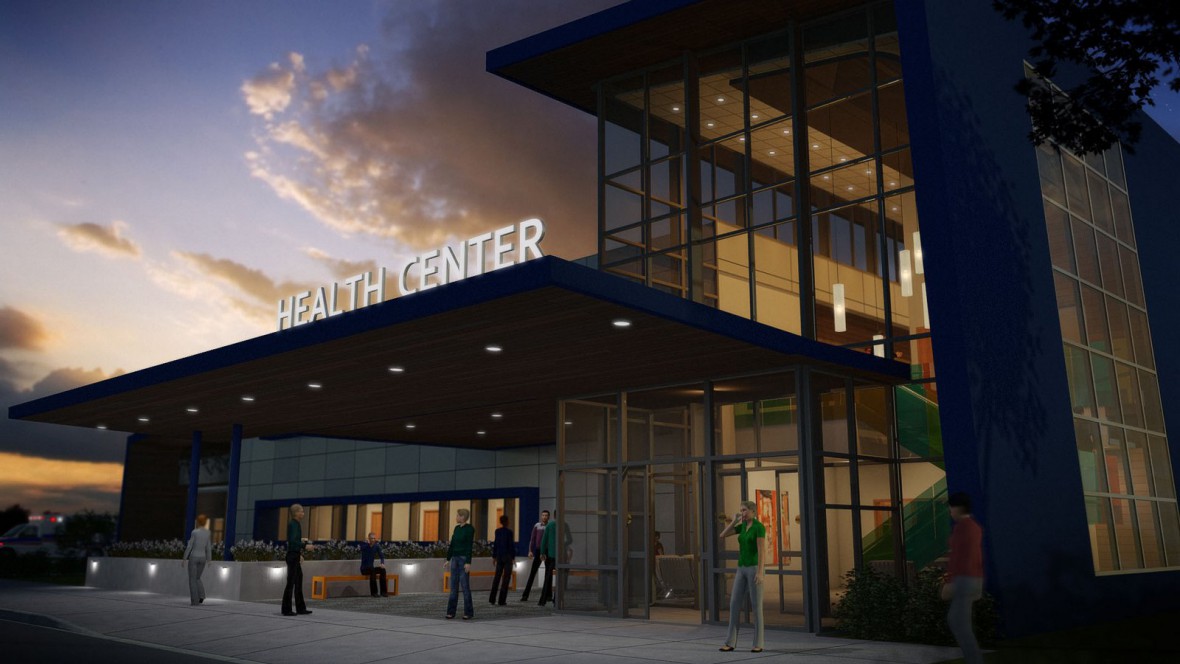 Image developed for Test Drive BIM and AMP Building Specialization campaigns, and the BIM Workshop. Rendering of a health care center designed in Revit and rendered using 3ds Max Design. Image illustrates a workflow between Revit and 3ds Max Design.